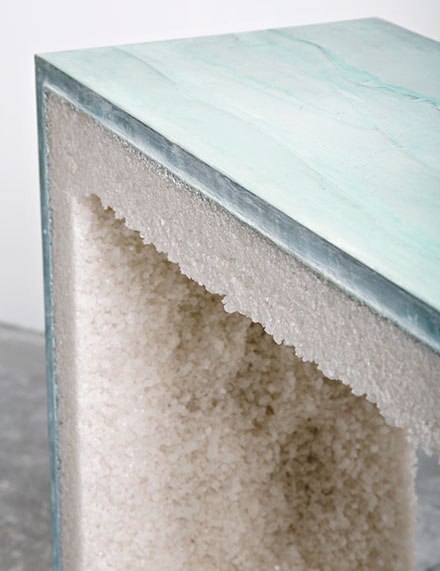 In the Brooklyn workshop of AMMA Studio, ordinary materials await alchemical transformations. Piles of salt, ground coffee, and other commonplace substances are mixed with clear resin, which binds the grains before they're joined with cement and molded into strikingly beautiful furnishings. For founders Samuel Amoia and Fernando Mastrangelo, using such unconventional media, rather than wood or stone, is a way to bring something new to the table—figuratively and literally. "I look at furniture all day long, and it's always the same stuff, made with the same materials," says Amoia, who has his own eponymous interior design firm as well. Mastrangelo, an artist, adds, "Our idea was to do something totally fresh. If you buy a slab of marble, you already have something gorgeous. But if you start with the everyday and elevate it, you can achieve something intriguing, something special." A drum stool, for instance, fuses baby-blue cement with pink Himalayan salt, producing exquisite strata of color and texture. A rectilinear side table is composed of a spare cement shell with a luminous silica lining. And a large-scale faceted mirror features a frame encrusted with navy-blue glass crystals. Although the pair just launched AMMA Studio in May—offering both limited-edition and custom-made creations—they've already received a string of notable commissions, among them pieces for Soho House in London and Berlin and for DeLorenzo Gallery in New York. The design establishment, meanwhile, is buzzing. "I love the concept behind AMMA," says AD100 decorator Stephen Sills, for whom Amoia once worked. "Their furnishings have such an elegant, minimalist quality." The duo, for their part, are just enjoying the crossover between their independent professions. "It's sculptural furniture that can be viewed as art but is fully functional," emphasizes Amoia. As Mastrangelo notes of the pieces' often soluble origins, "even if you pour water on them, they're not going to melt." ammastudionyc.com -TIM MCKEOUGH
