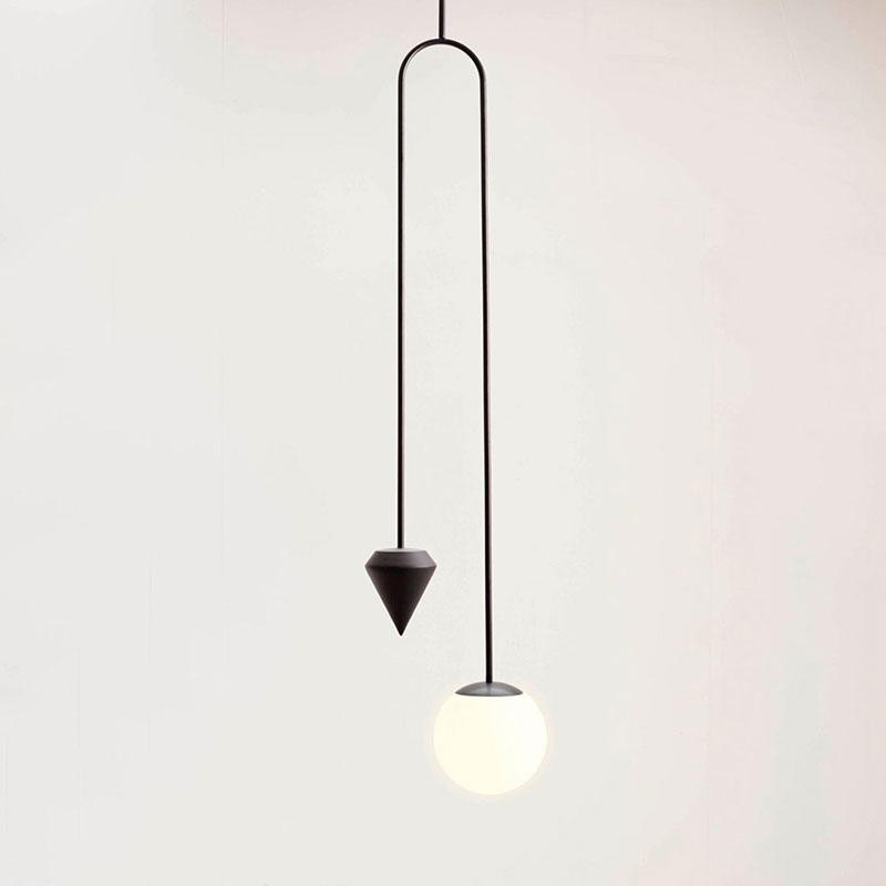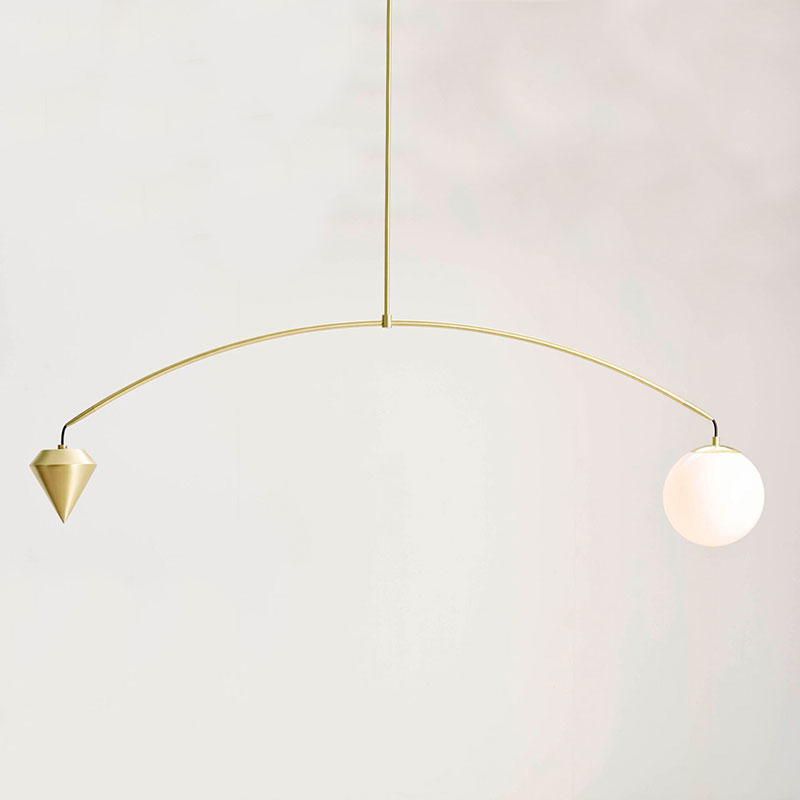 A beautifully tapered stem balances a perfect white glass orb with a brass plumb weight.