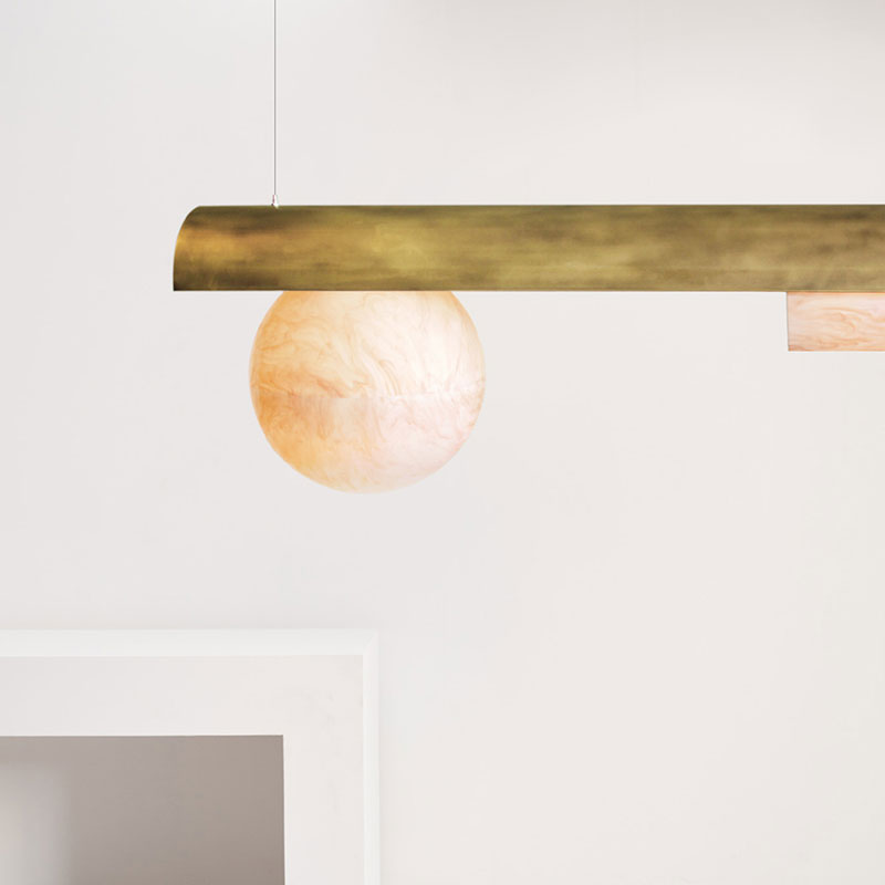 Available in brushed brass and satin black (a rich warm black). Ceiling stem lengths are cut to your requirements.