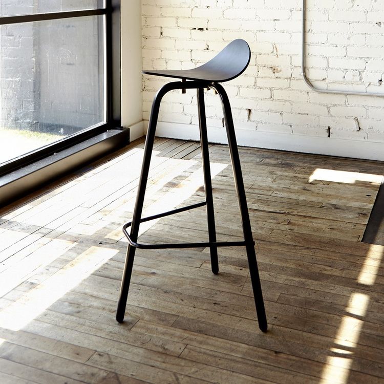 The Biker Stool from Castor is a refined and sculptural seat that is available at both chair and bar heights. Inspired by the geometry of a motorcycle seat, the stool's seat features a curved and angled silhouette. The seat is lined in leather and is connected to tubular steel legs, furthering the connection to its industrial origins. The legs and seat are joined by custom machined brass "bungs" which add a touch of shine to the stool.