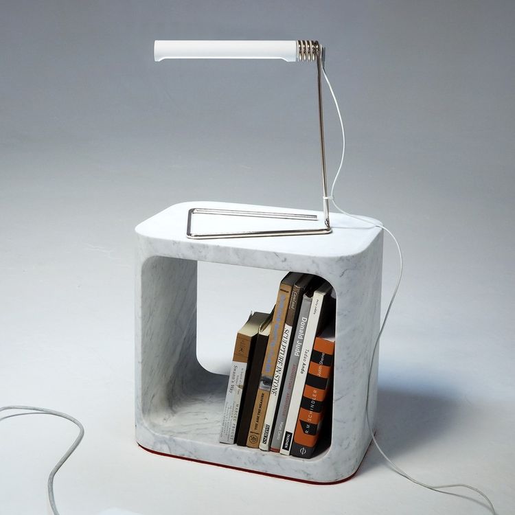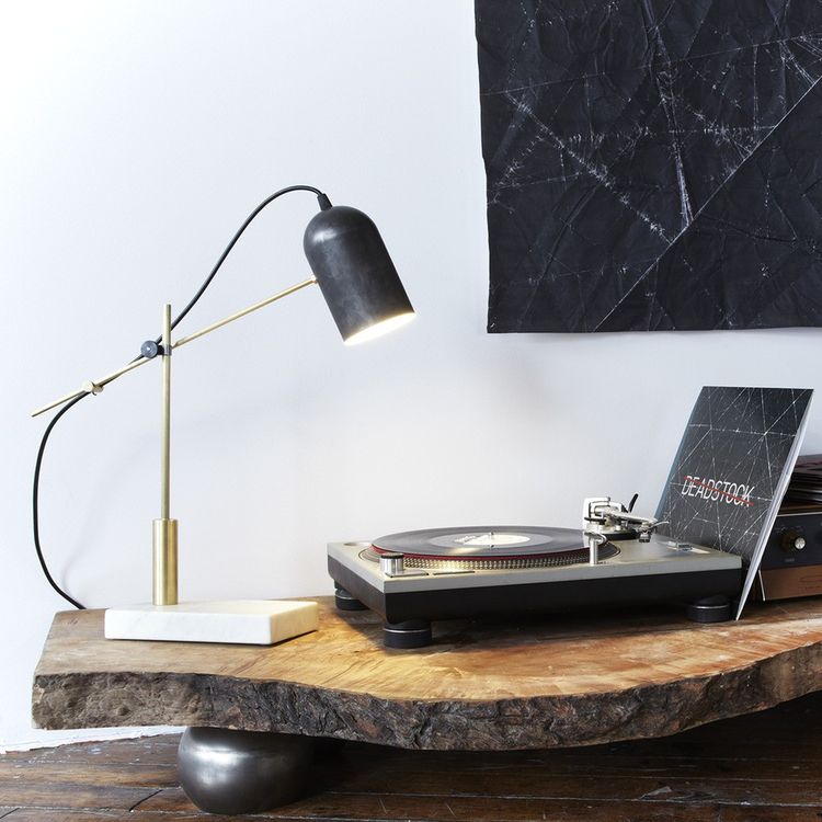 The Deadstock Catherine Table Lamp from Castor is a stunning example of the possibilities of mixing materials. Centered around a cylindrical shade salvaged from a defunct lighting factory, the Catherine Lamp is supported by a precisely machined brass stem and cantilever, which is supported by a Carrara marble base that was salvaged from the First Canadian Place in Toronto. The structure of the lamp enables it to be adjusted, making it easy to redirect light as needed.
