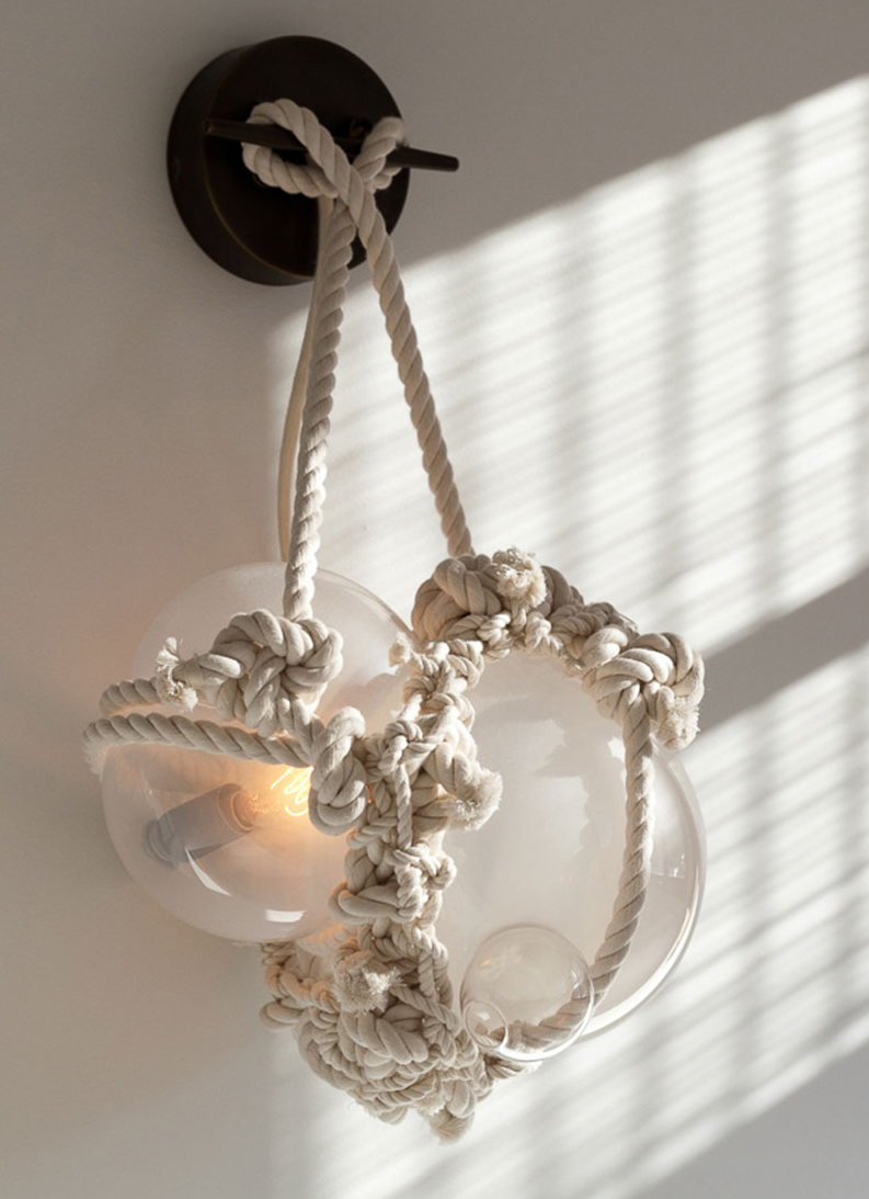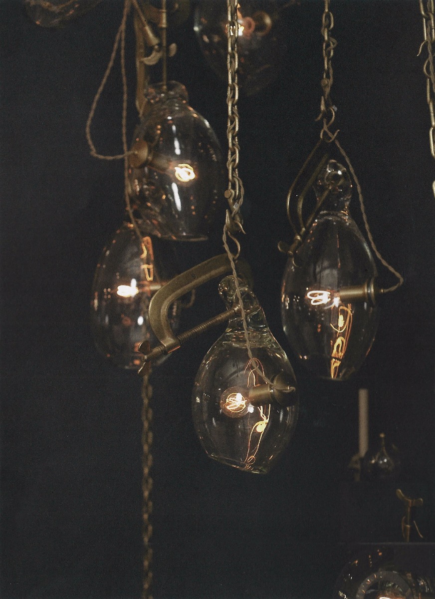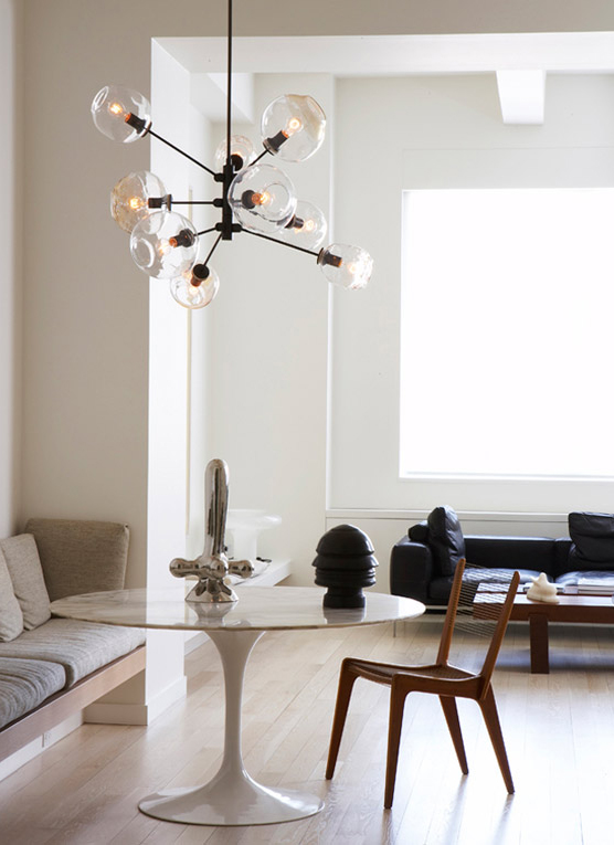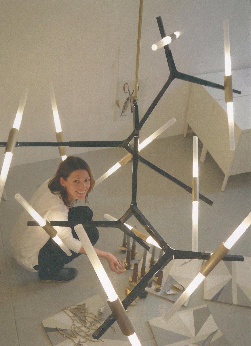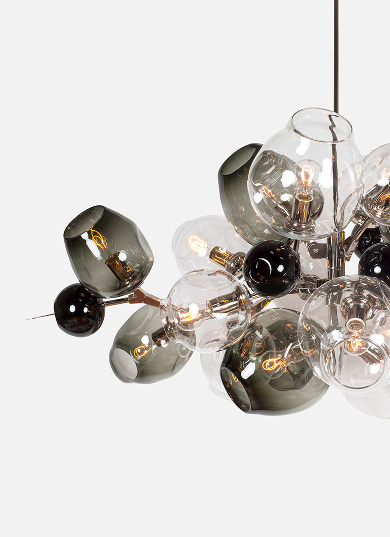 Branching Chandelier with custom powder-coat arms, brass hardware and porcelain shades