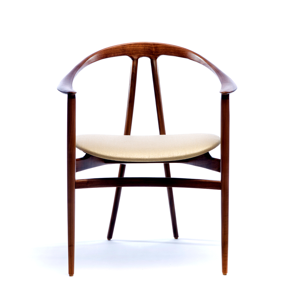 This solid wood chair is crafted by hand, using mortise and tenon joints. The sweeping, sculptural armrest creates a striking silhouette that embraces the body. An upholstered back-pan is optional while the upholstered seat provides a high level of comfort and a floating appearance. Tapered, splayed legs extend in an elegant curve from the top of the seat-back to the floor. The Bianca Chair is equally at home around a table or standing on its own as an accent.