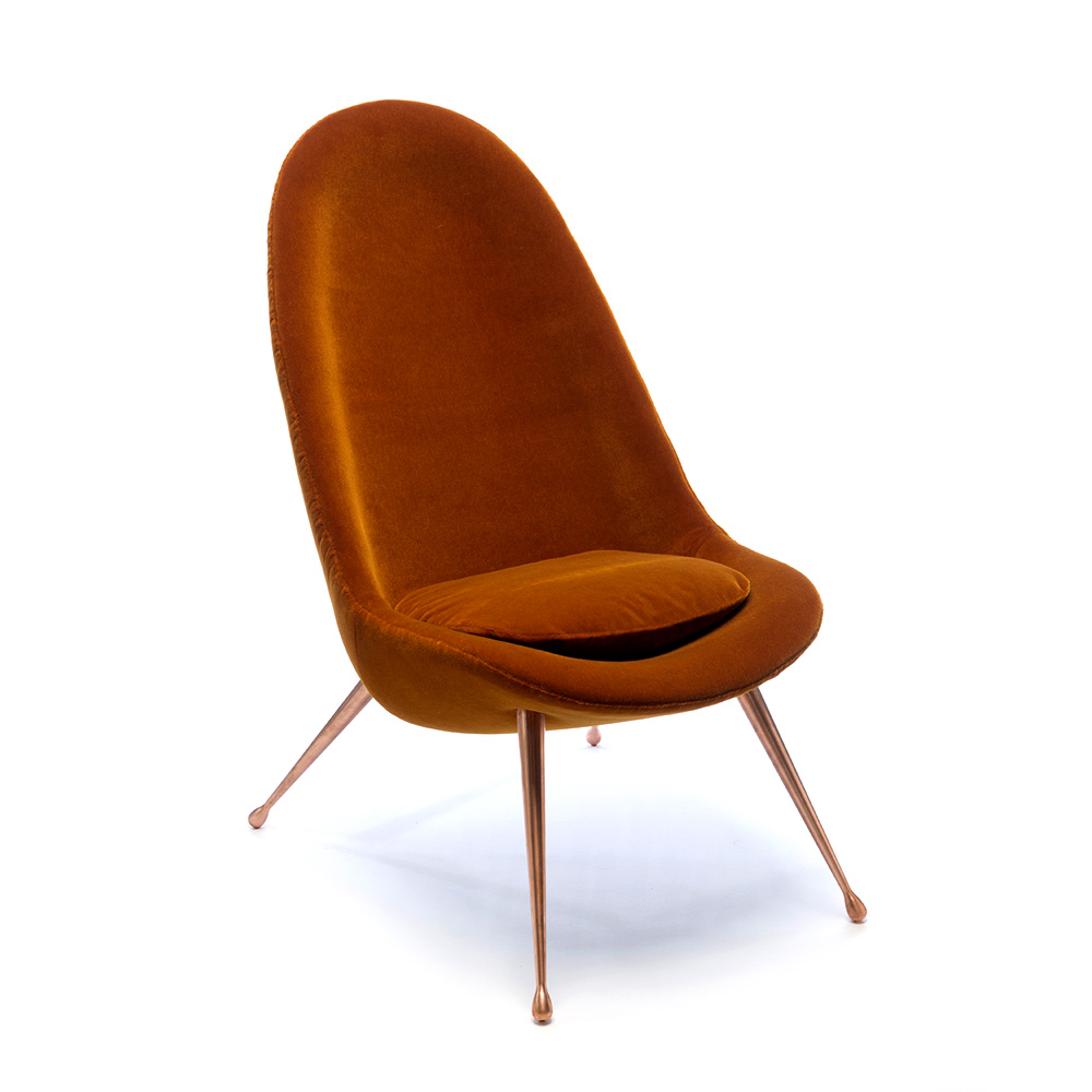 The Pause Lounge Chair, intended as the ultimate seat to unplug and relax, plays off Konekt's signature Pause Chaise. Balance is achieved with its modern, organic design and expertly upholstered seating. The curvaceous fiberglass shell embraces the body, the upholstery is meticulously hand-sewn, and the four splayed metal legs taper down to teardrop-shaped feet.