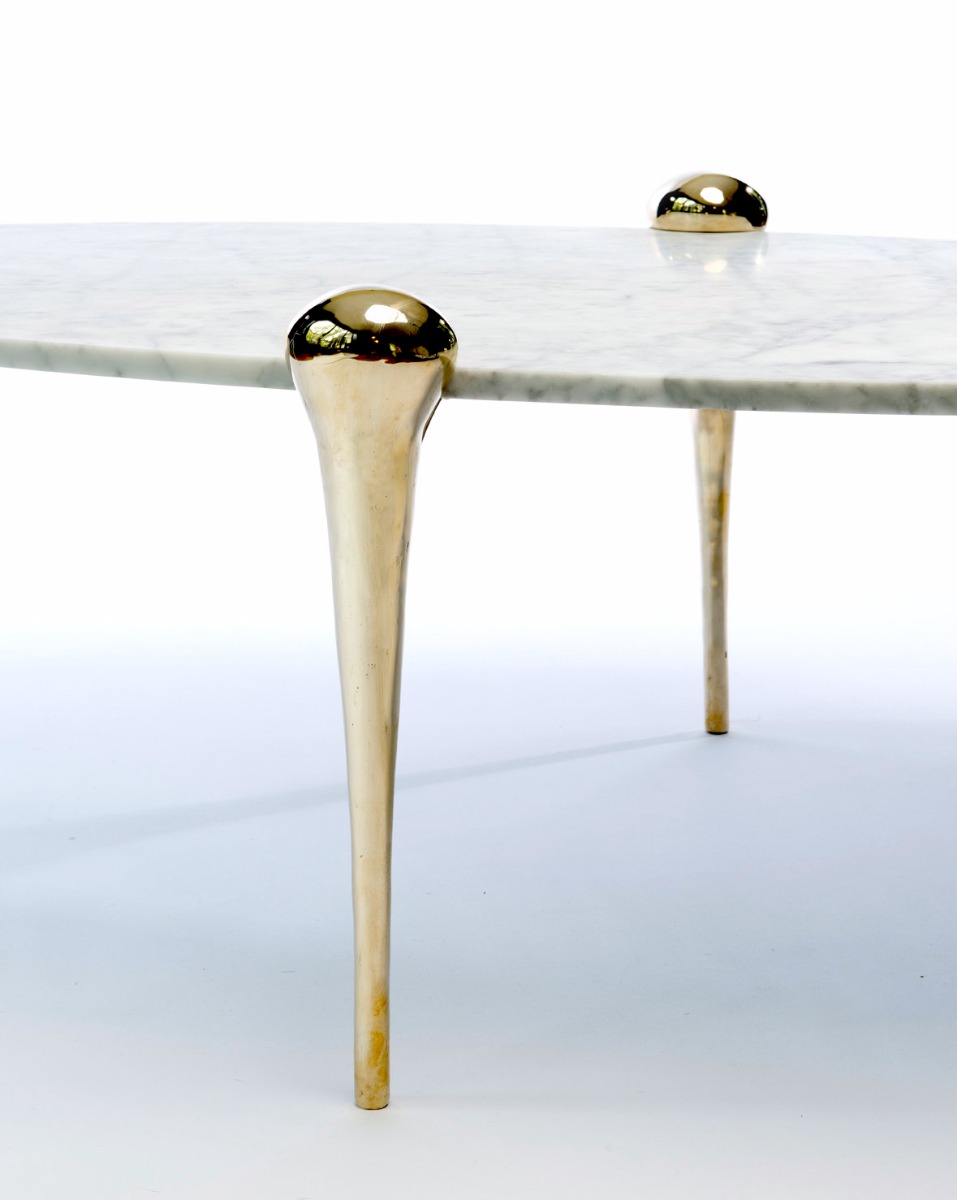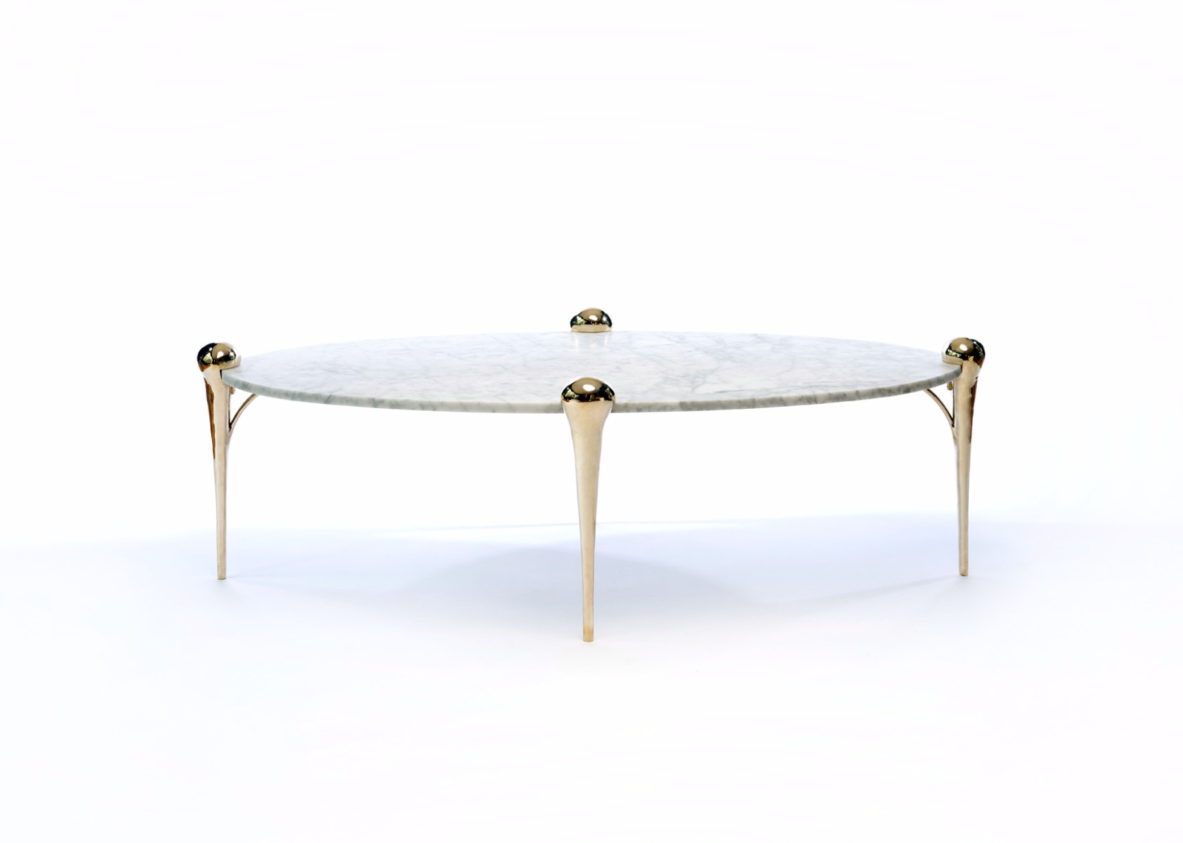 The legs of the oval-shaped Petra Coffee Table are inspired by the legs of a camel. The Petra features a precision cut, honed marble tabletop and sculptural legs of cast bronze.