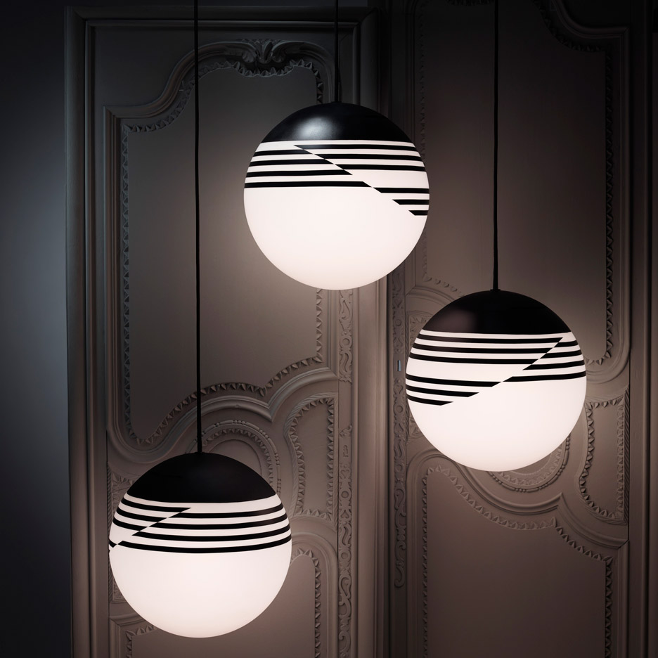 Lee Broom’s new series, “Optical”, will feature globe pendants and globe floor lamps with a pattern of disjointed black stripes as a throwback style to the 1990’s.