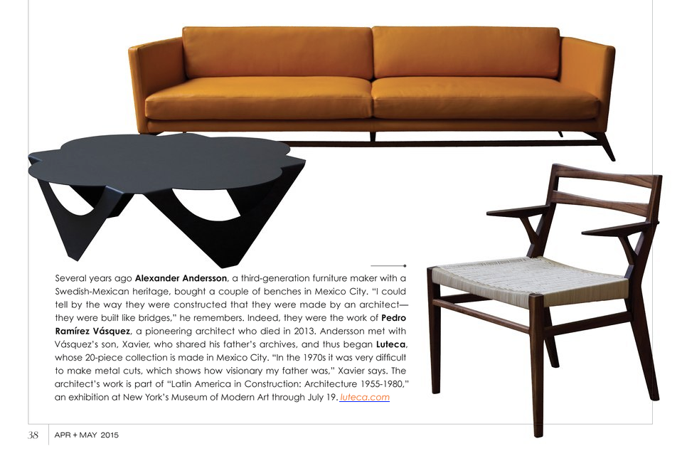 Several years ago Alexander Andersson. a third-generation furniture maker with a Swedish-Mexican hefitoge, bought a couple of benches in Mexico City, "I could tell by the way they were constructed that they were made by an architect—they were built like bridges," he remembers. Indeed, they were the work of Pedro Ramirez Vasquez a pioneedng architect who died in 2013. Andersson met with Vasguez's son, Xavier, who shared his father's archives, and thus began Luteca, Whose 20-piece collection is made in Mexico City. In the 1970s it was very difficult to make metal cuts, which shows how visionary my father was" Xavier says. The architect's work is part of "Latin America in Construction: Architectare 1955-1980," an exhibition at New York's, Museum of Modern Ad through July 19.