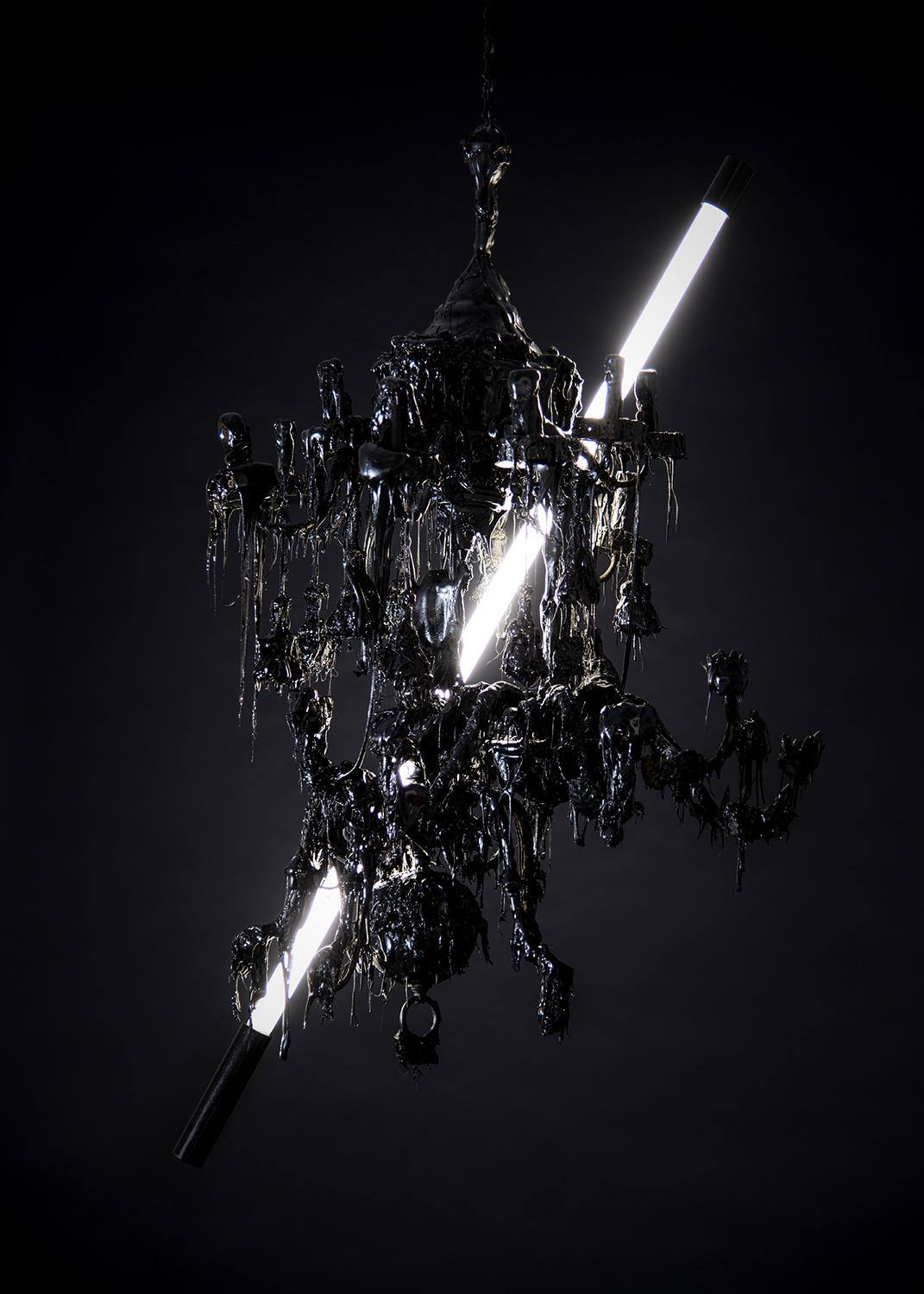 The dynamics of transformation is a driving concept and process behind Biagi’s work, in particular the transformative power of coating everyday objects with layers of viscous tar. In this context the decorative baroque chandelier, the ultimate symbol of domestic luxury, has its symbolic and cultural value subverted and transformed into an object of unexpected dark beauty, made all the more mysterious by the addition of a single minimal, modern light source penetrating it. The chandelier remains a light source, but not at all with the same meaning or purpose it once had. Its purpose has been undermined and yet somehow made more sublime through a mysterious rather than ostentatious beauty.