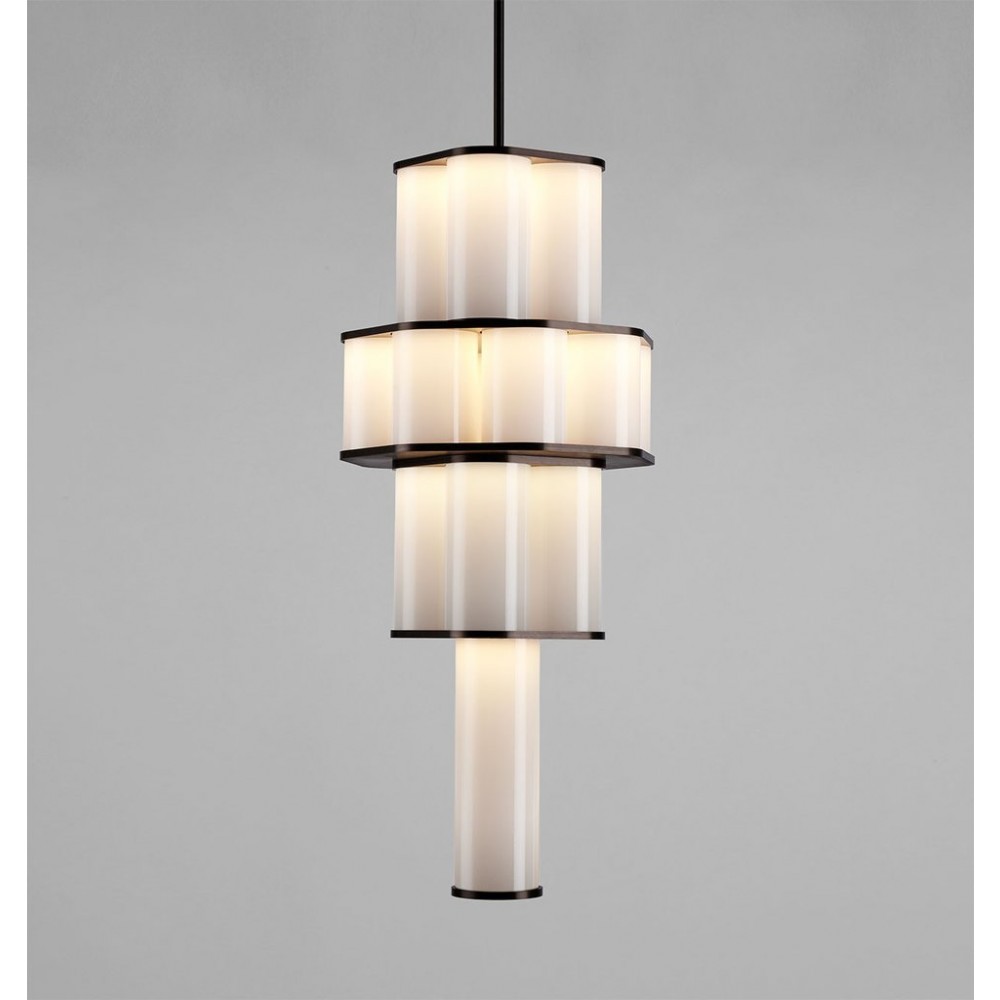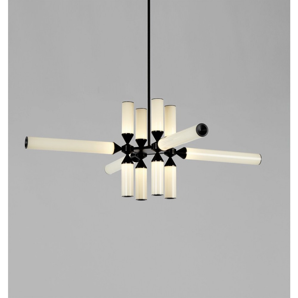 Jason Miller’s Bauer is a pendant fixture made of stacked, concentric clusters of handblown tubular glass. The glass fades from dark to light, recalling the tonalities of earth-to-sky views, producing an ethereal, atmospheric effect.