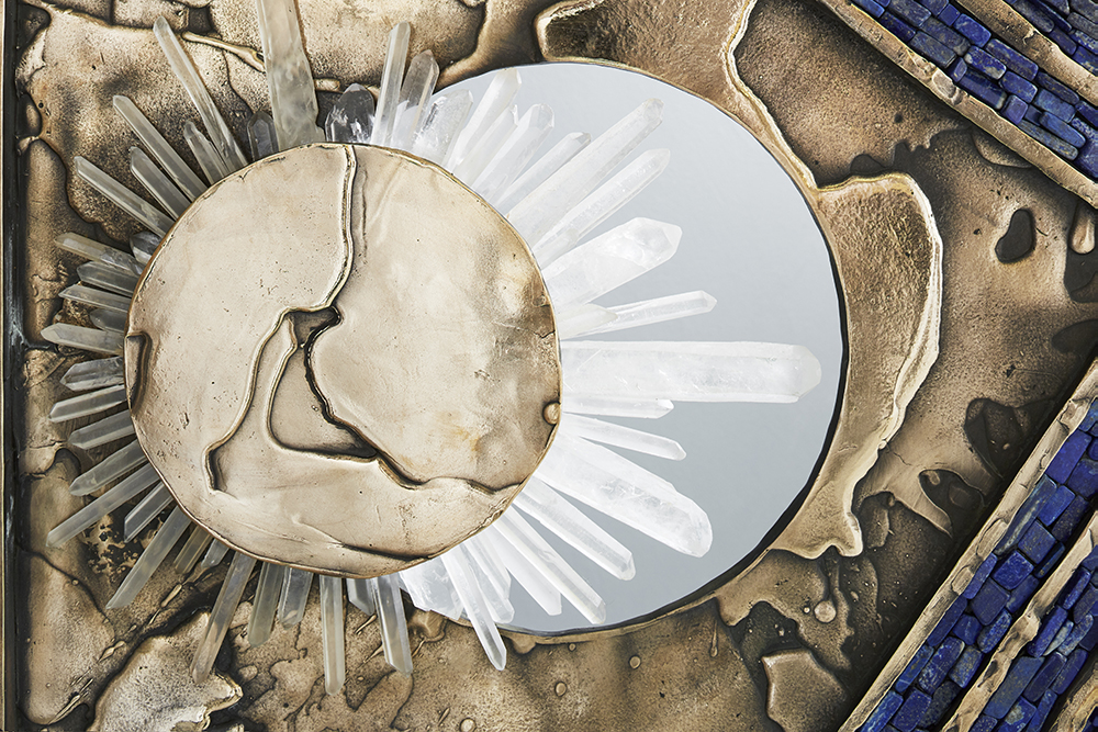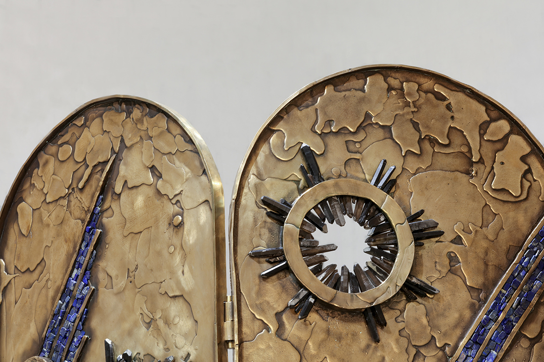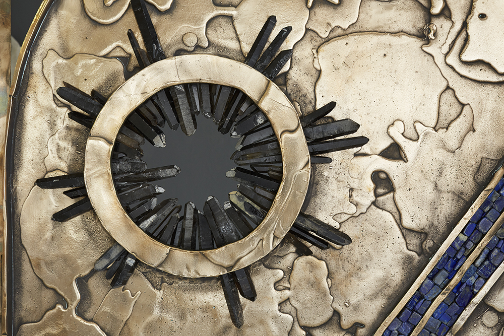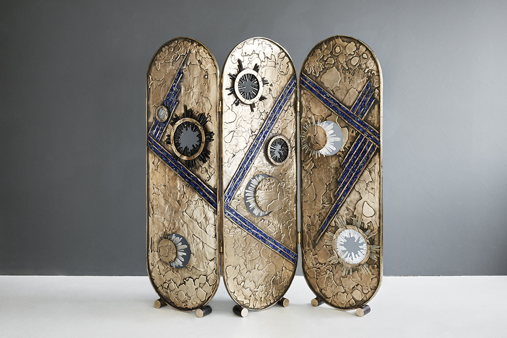 Christopher Boots spectacular creation, Vanity Screen, is a project of love that has taken four years to realize. Presented at Collective Design in New York in May 2017, the room divider incorporates clear and smoky quartz crystal and lapis lazuli in contrast to a moon like surface cast in solid bronze. The celestial screen is the first in a limited edition of eight.