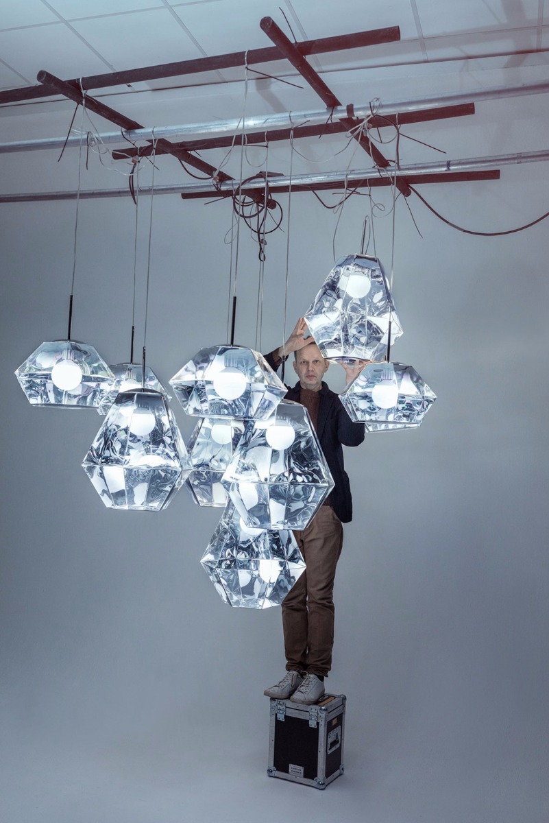 "Futuristic and faceted, Cut is an exercise in optics. Its space-age mirror finish when off transforms to reveal a translucent kaleidoscopic gem when switched on. Hypnotising reflections of the luminous orb within repeat infinitely within the diamond cut, vacuum metallised interior."