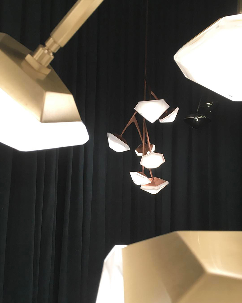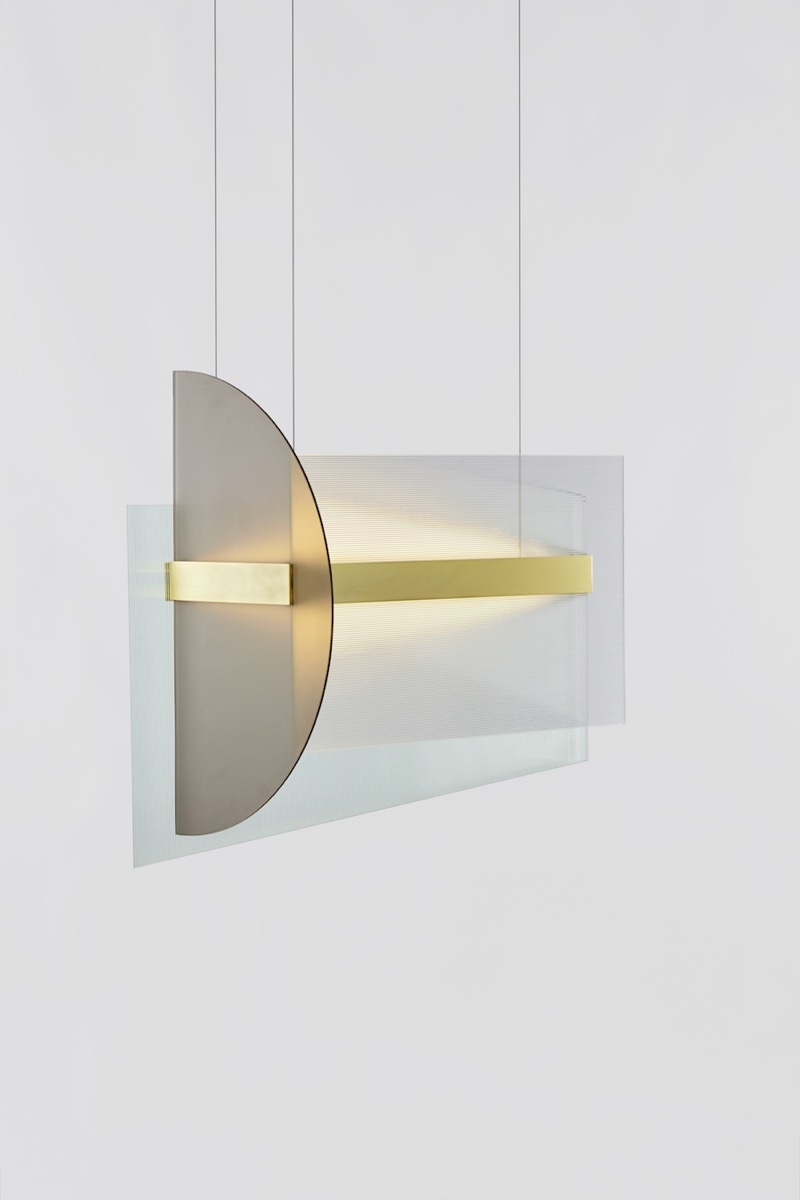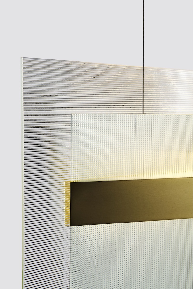 "Striated, ribbed glasswork casting complex compositions of shadow, light and color played a big role at Euroluce, the biannual lighting-focused exhibition presented under the Salone umbrella. New York City-based showroom Roll & Hill exhibited a new rectangular Kazimir pendant, a layered, dichroic piece designed by Ladies & Gentlemen Studio and named after the Constructivist artist Kazimir Malevich."