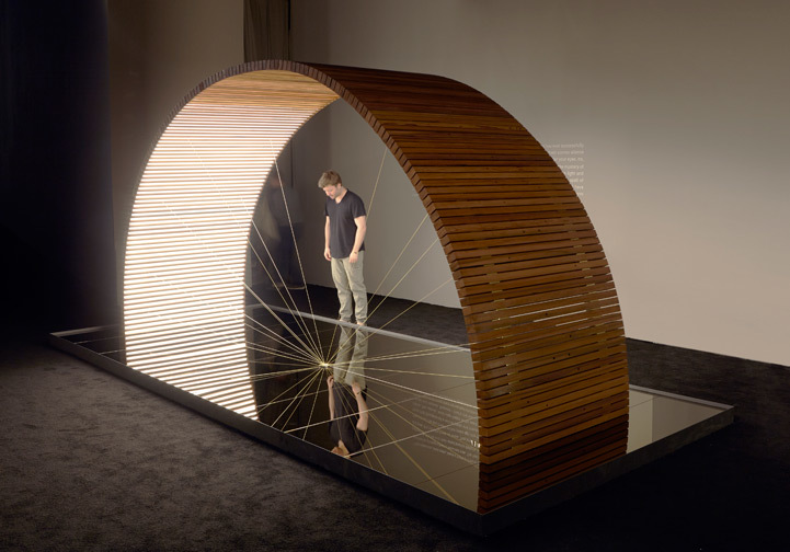"A light installation composed of redwood beams—carbon dating says they’re three centuries old—salvaged from a downtown Manhattan water tower has garnered much attention and taken home NYCxDESIGN’s Best In Show honor for the year. 'Ambassador,' a 16-foot-wide by 8-foot-tall installation by lighting brand Stickbulb in collaboration with RUX, radiated an arc of light over attendees at the Collective Design Fair, held at Skylight Clarkson Sq.