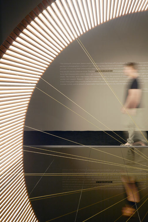 Nearly 150 beams were salvaged for the installation, which was designed to reflect the towering redwoods characterized in John Steinbeck’s book Travels With Charley. (In the classic, the author writes, 'The vainest, most slap-happy and irreverent of men, in the presence of redwoods, goes under a spell of wonder and respect.')