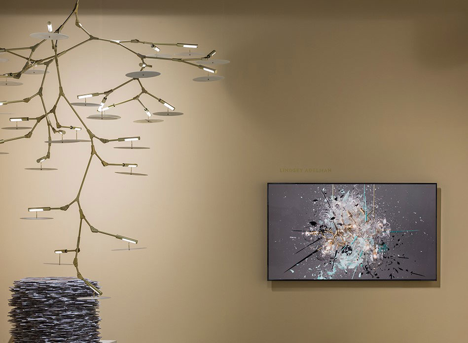 The massive Branching Disc chandelier featured Nymphenburg porcelain discs and a brushed brass structure. This large work organically roots down from the ceiling into the space. Photo courtesy Wallpaper* Magazine.