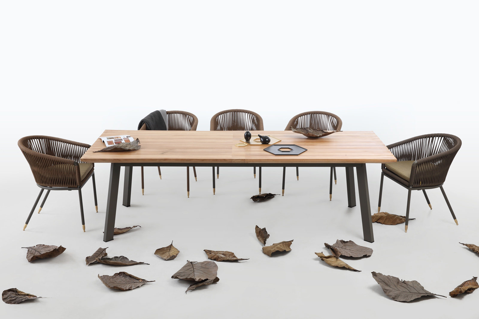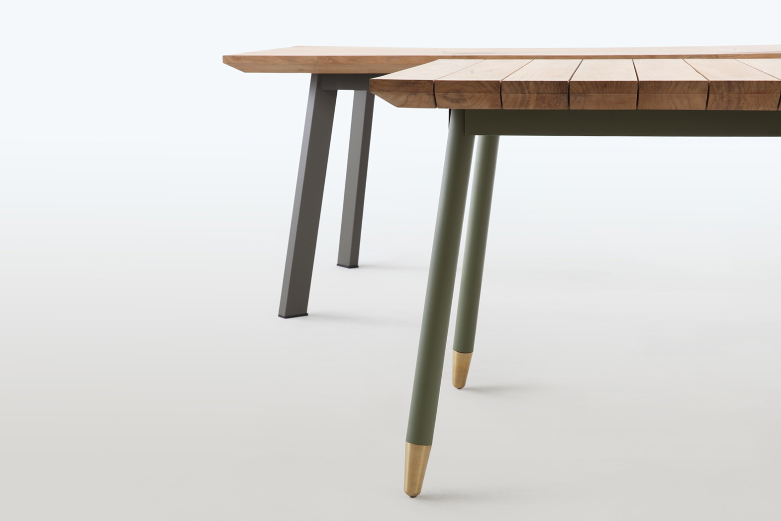 Plank is a series of outdoor tables available with teak or walnut tops combined with either square or round legs. The round leg version of Plank is accented with solid brass tips.