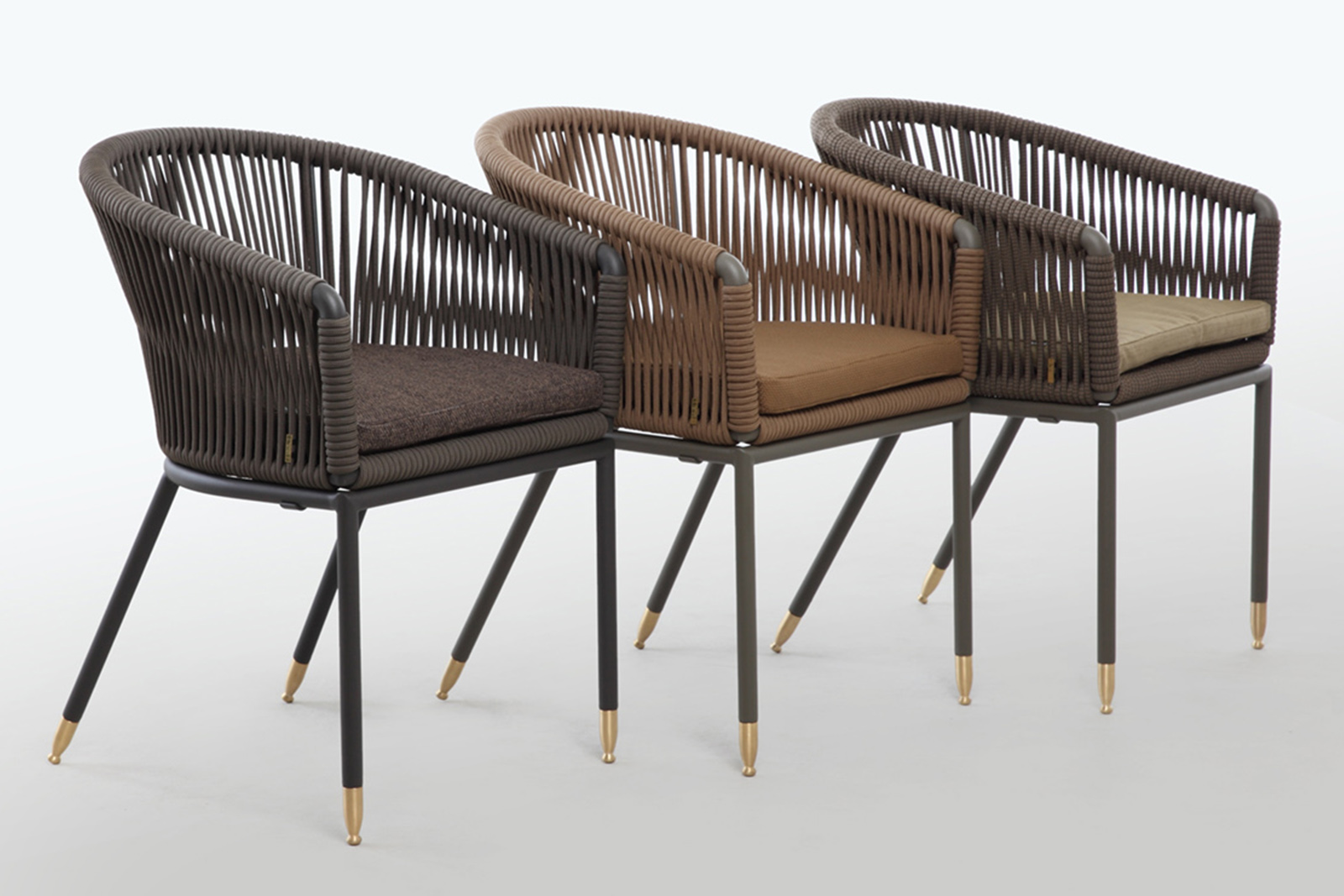 The Chair 7 is a modern outdoor dining chair with a four legged metal base available in 13 powder-coat colors. The shell design is woven in Lebello's exclusive Tech-Rope material and features accented leg tips finished in solid stainless or solid brass.