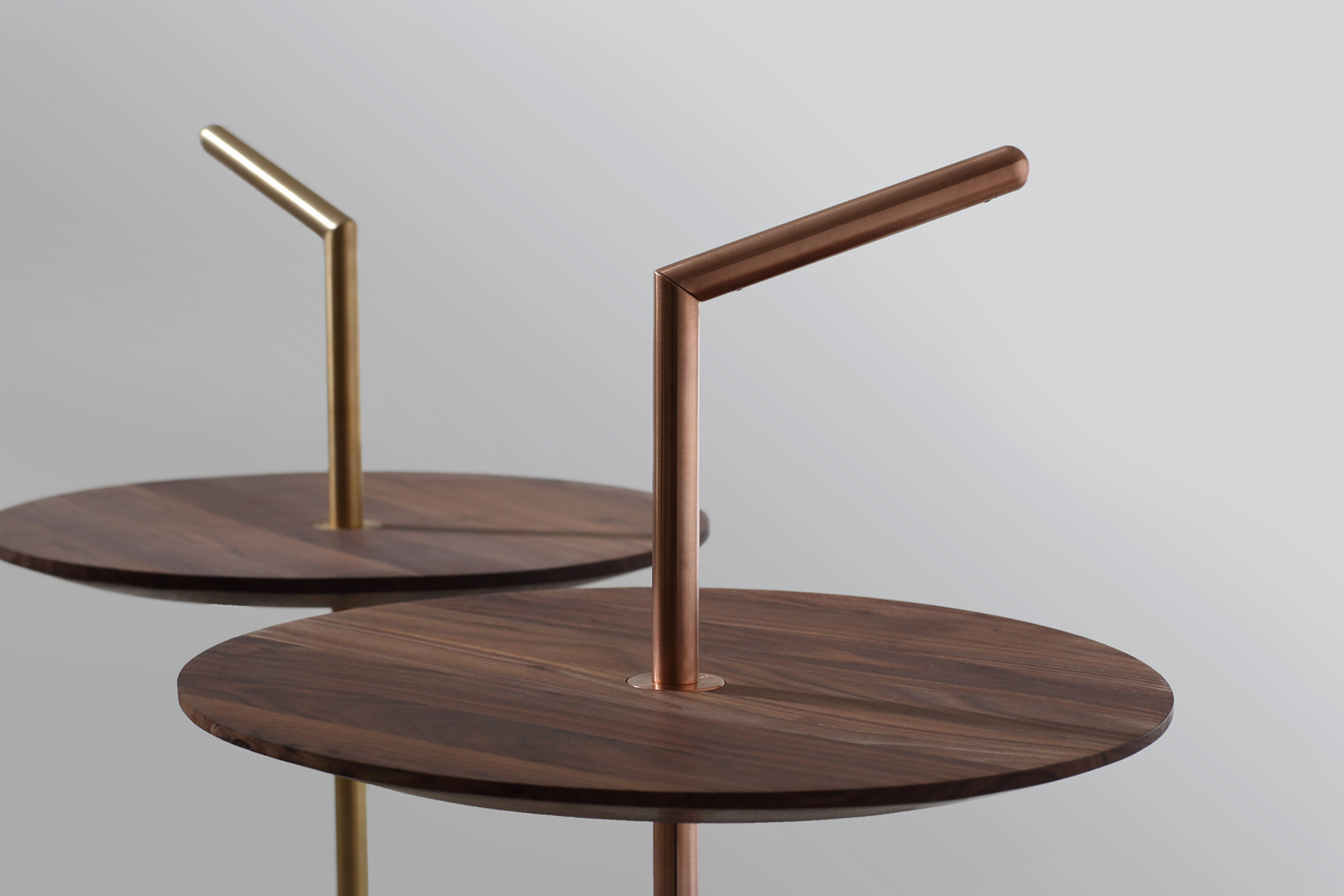 Taking inspiration from the mangrove plant, Roots is a unique collection of tables finished in brass, copper or stainless. This solid metal tripod table is available with an optional handle or a LED light to illuminate the surface. Tops are available in teak, walnut or CL.
