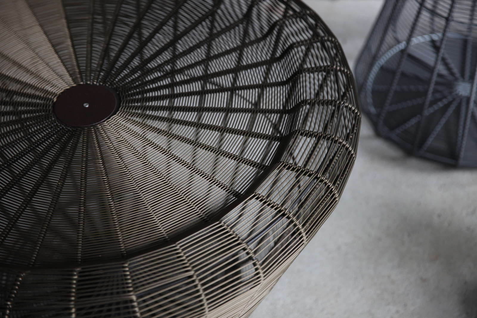 The designs are finished with Lebello core fiber materials that are spun around zinc-plated or stainless frames. The fibers are spaced at a variety of distances creating a complex array of lights and shadows.