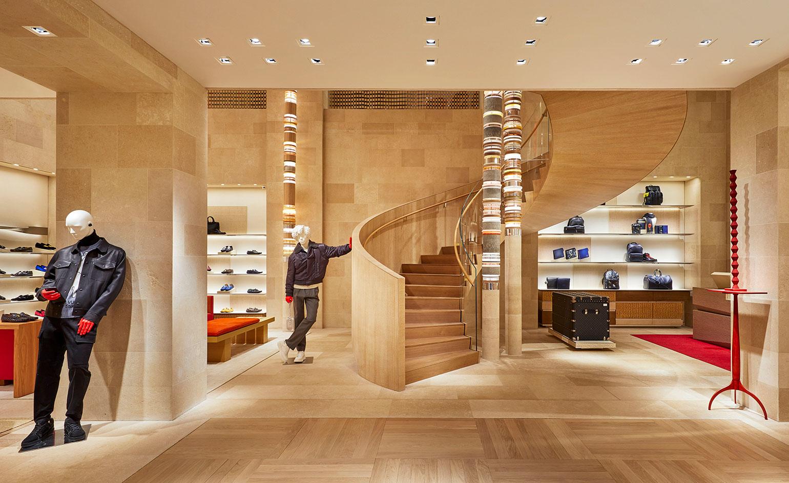 Long-term Vuitton ally Peter Marino is known for his big, sexy, gallery-cum-galleria projects. In 2017 he returned two hôtel particuliers at 2 Place Vendôme in Paris to their former glory, creating a vast, sun-soaked home for Louis Vuitton, studded with bold artworks and site specific installations. This week, the brand’s revamped 17,500 sq ft London Maison on New Bond Street opens its doors after 14 months in the making. Step over its Damier check threshold made of warm Croix Huyart limestone and cool Pierre Bleue du Hainaut marble – bathe in luxury and light.