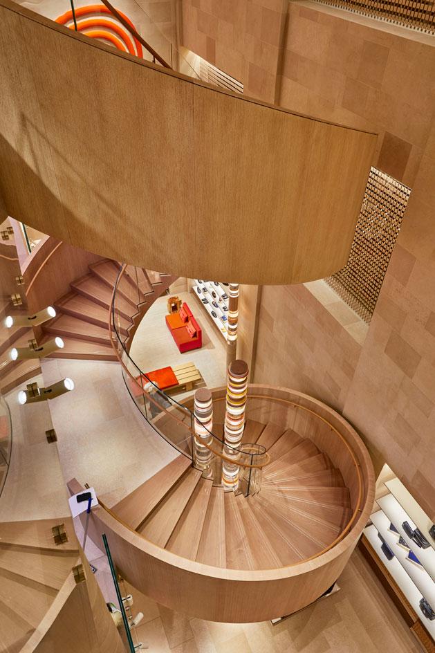 Gone is Marino’s once newfangled, illuminated LED floor and staircase – installed when the store first opened in 2010. It has been replaced with a softer, double helix cerused oak structure that now quietly connects three floors. The towering wall of trunk shelving has gone too, as has the darker wood cabinets – the immensity replaced with a convivial allure. Sections of the middle floors have been cut away to create a double height void, a vast skylight lending a voluminous, bright élan to the passing parade.