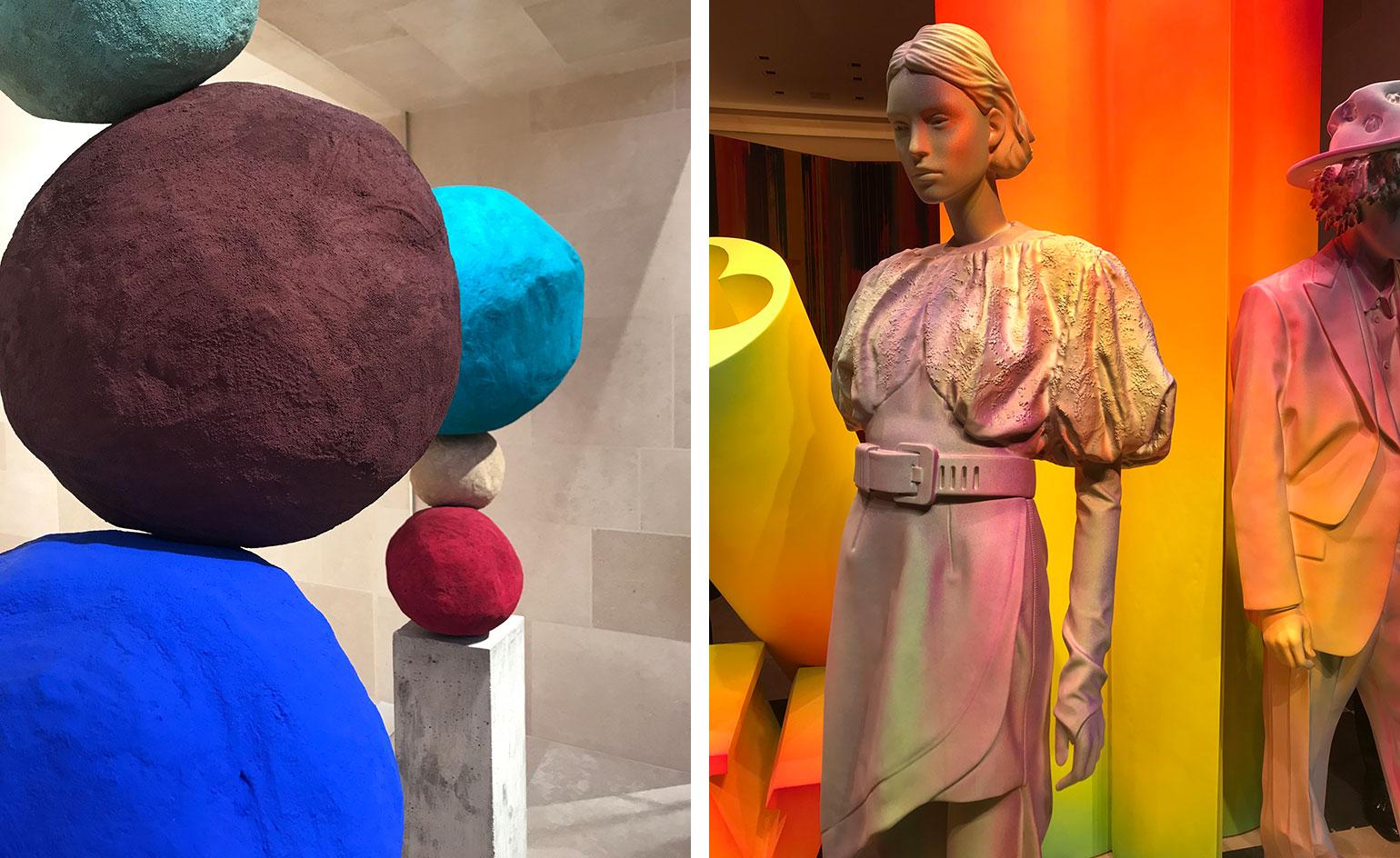 In among the wares are antique African anklets, mid century Danish furniture, Jean Touret cabinets and piles of books, vases of seasonal blooms. Four Cocoon chairs by the Campana Brothers hover high in the main atrium, heralding the arrival of a dedicated space for Objets Nomades, Vuitton’s full travel and homeware collection. The pieces inject pops of colour to the stone toned interior. British artist Annie Morris’ colourful spherical totems have been transported from the Place Vendôme store, here placed against a glass wall so they can be seen across the third floor balcony.