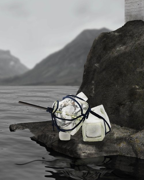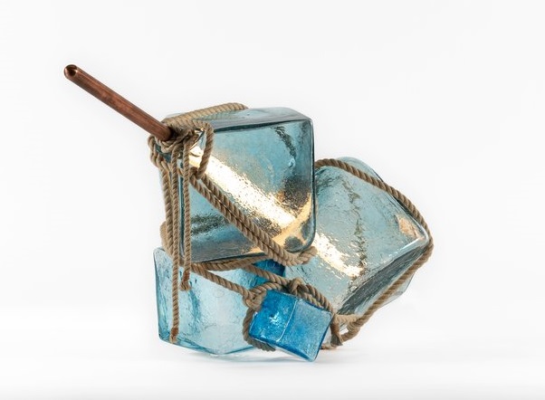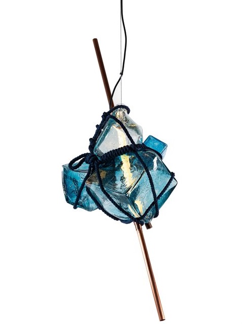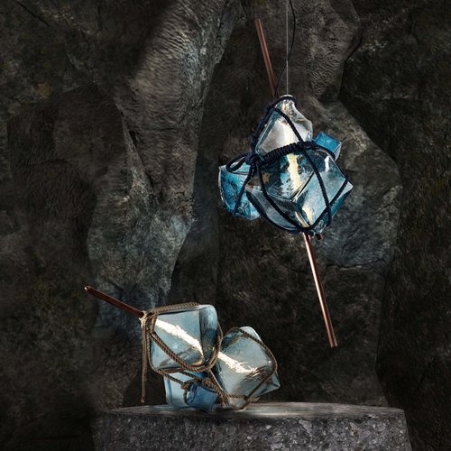 Some of these assemblages are then transformed into tabletop and suspension lighting, through the use of custom lightsaber shaped LED fixtures piercing through the core of the glass, revealing their ocean-like texture. Without the lighting component, others act as pure glass sculptures. Finally, some are transformed into sound sculptures, playing an original ambient oceanic soundtrack, allowing the glass to be translated into a sonic medium.
