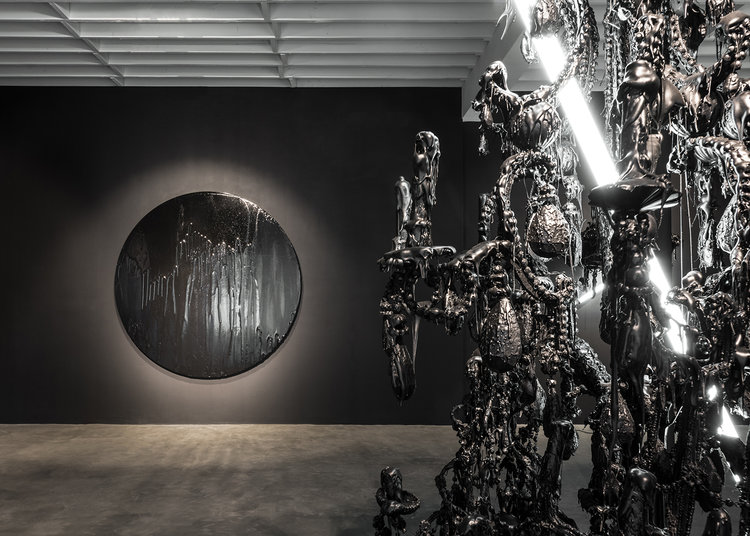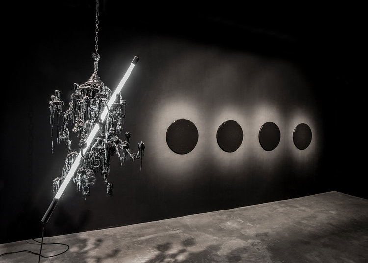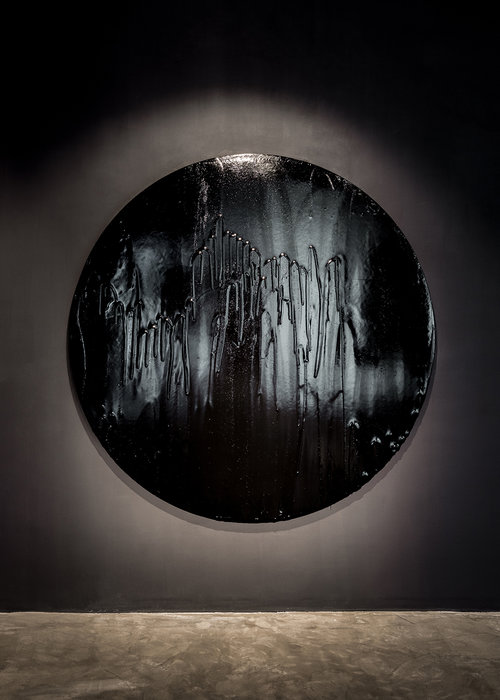 Alongside the chandeliers are a new series of round paintings. Here the transformative power of tar is explored on its own terms, as the singular materiality of painting. The black disks are reminiscent of vinyl records, an indirect reference to another type of domestic object. While on one level these minimal yet richly textured tar forms conjure dark themes like voids or black holes, they simultaneously invoke the opposite, their perfect geometric circularity referencing solid presence, totality and completion.