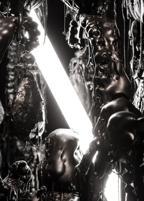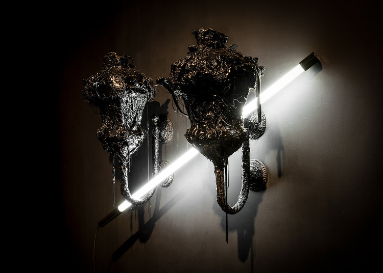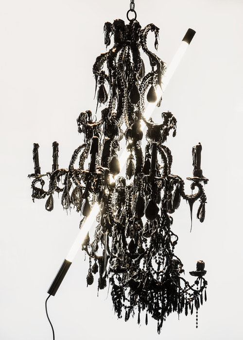 The dynamics of transformation is a driving concept and process behind Biagi’s work, in particular the transformative power of coating everyday objects with layers of viscous tar. In this context the decorative baroque chandelier, the ultimate symbol of domestic luxury, has its symbolic and cultural value subverted and transformed into an object of unexpected dark beauty, made all the more mysterious by the addition of a single minimal, modern light source penetrating it. The chandelier remains a light source, but not at all with the same meaning or purpose it once had. Its purpose has been undermined and yet somehow made more sublime through a mysterious rather than ostentatious beauty.